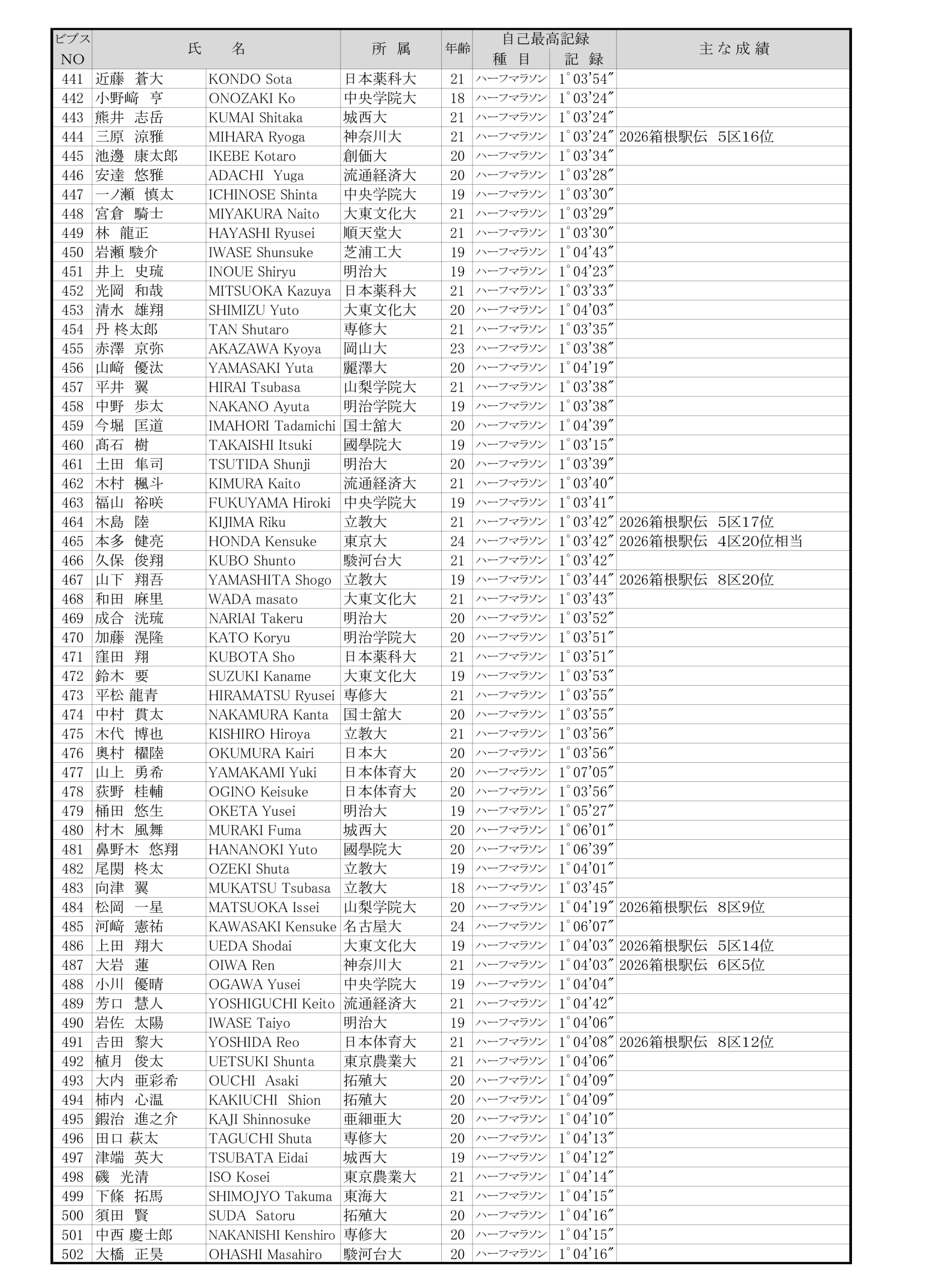 ■日本学生ハーフマラソン 招待選手